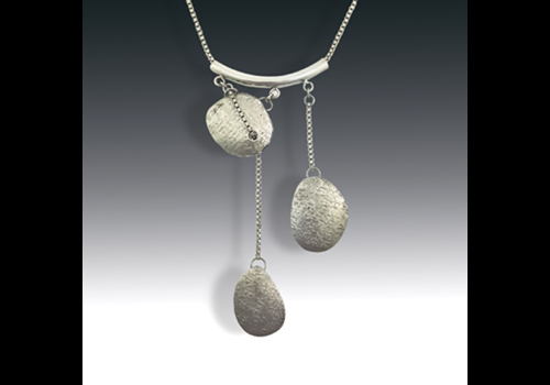 The Pebbles series was inspired by my love of the gardens. Pebbles are used in so many ways to accent garden designs and love the flowing nature of their shapes. The pebbles are textured on one side, high polish on the other for a reversible necklace design. Available in a variety of metal choices. Please specify length.